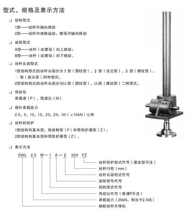 概述SWL系列蜗轮螺旋丝杆升降机又称QWL升降机以及螺旋升降机广泛应用于机械、冶金、建筑、水利设备等行业,具有起升、下降及借助辅件推进、翻转及各种高度位置调整等诸多功能.SWL蜗轮螺旋丝杆升降机是一种基础起重部件,具有结构紧凑、体积小、重量轻、动力源广泛、无噪音、安装方便、使用灵活、功能多、配套形式多、可靠性高、使用寿命长等许多优点。可以单台或组合使用,能按_程序准确地控制调整提升或推进的高度,可以用电动机或 其他动力直接带动,也可以手动。它有不同的结构形式和装配形式,且提升高度可按用户的要求定制。 。该装置可以自锁