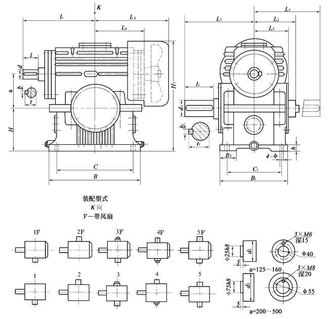 例 蜗杆在蜗轮之下, 中心距为200mm, 公称传动比为10, _种装配型式, 有风扇冷却的平面